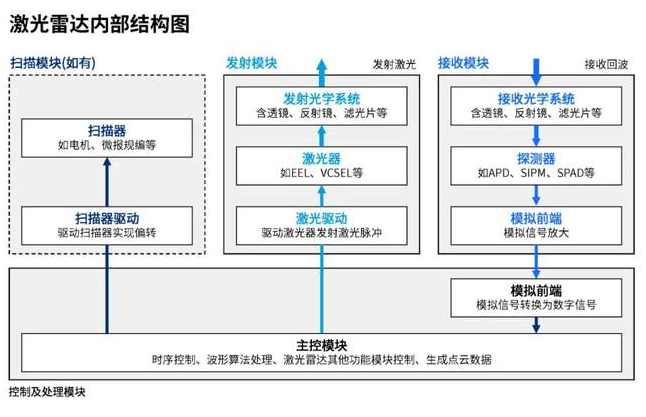 激光雷达的主要模块包括发射模块、接受模块、扫描模块和控制及处理四大模块。
