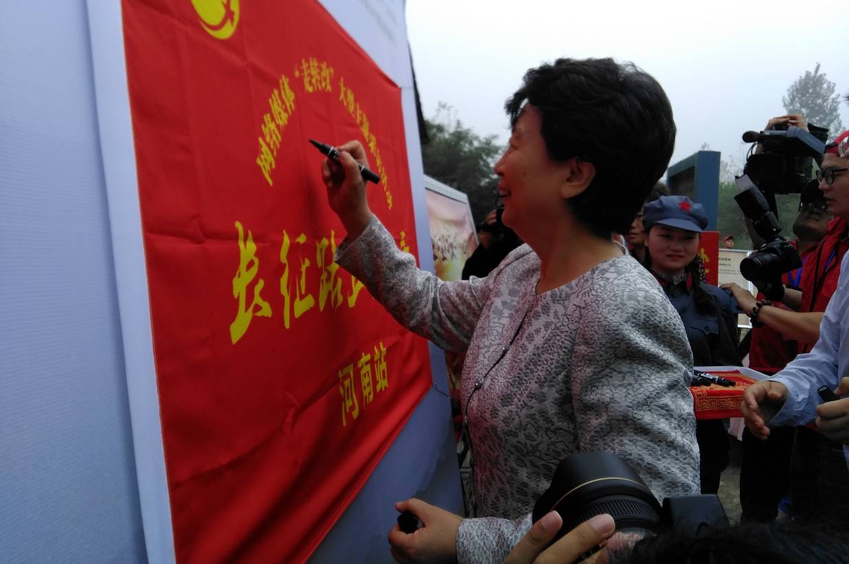 河南省委常委、宣传部长赵素萍出席启动仪式为采访团授旗,并签字留念。