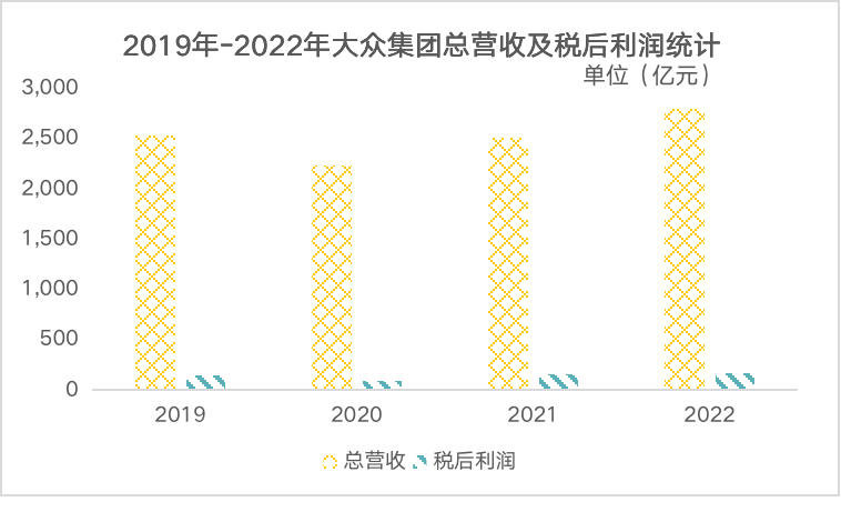 在过去的2022年,大众汽车的全球交付量为460万辆,同比下降6.8%,聚焦到全球各个地区,这个数字都是下降的。但是,可以看到,无论是营收还是净利润,大众都表现出不俗的实力。而如果将时间刻度拉长,可以发现除了2020年收到疫情波动较大,2019年、2021年、2022年大众的营收和净利润均保持在一个稳定的水平线上。