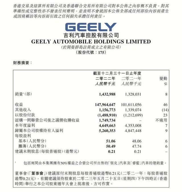 2022年,吉利汽车营收为1479.65亿元,同比增长45.6%,归母净利润达到52.6亿元,同比增长8.5%;