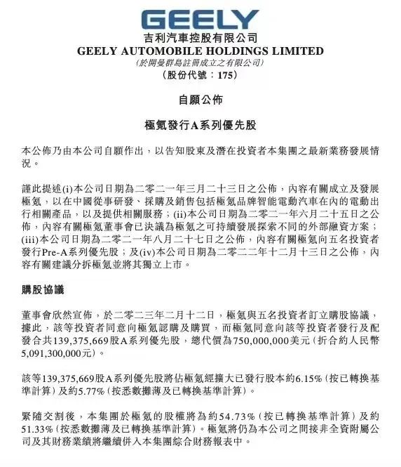 前不久,极氪还完成了7.5亿美元的A轮融资,投后估值达130亿美元,这也是今年以来整车领域的第一笔大额融资,充分体现出产业资本对其综合实力和市场潜力的认可。与此同时,我们也应该看到,在这笔融资背后,吉利作为其母体所发挥的“稳定器”和“兜底”作用,给了产业资本更大的信心。