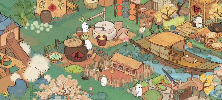 哥哥浮光偶尔会在田间吹响山笛,妹妹淘淘会突然在桃花树下捧起花瓣玩耍,偶然放大屏幕,屋檐还停留一只啾啾小鹦鹉。萝卜山灵负责不同的建造物,萝小磨研磨面粉,有着三片叶子的萝小缸,专职研制美味酸菜,无事干时,它们会在村落转转,突然派活时就忙不迭跑回去,带着或欣喜或郁闷的表情。收成时,兄妹则帮忙搬运至粮仓。
