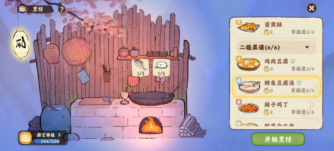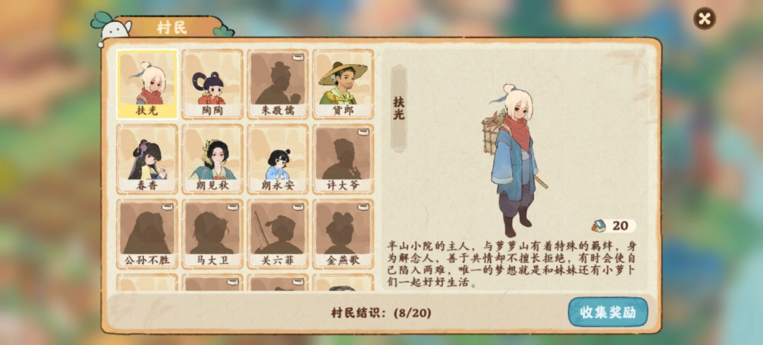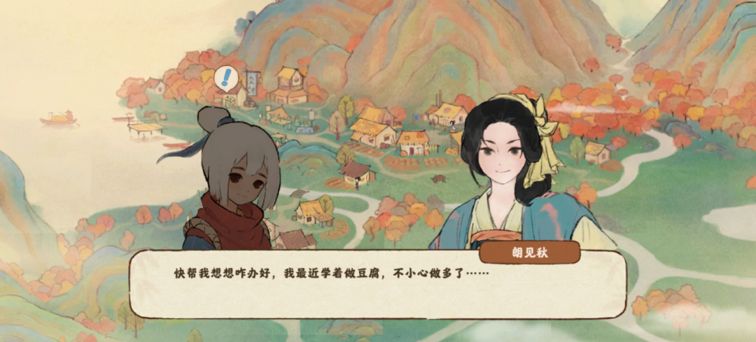 这种经营逻辑赋予了烟火气息。当村民上山,兄妹俩用生活常识开发菜式,做些酸菜豆腐、蛋炒饭等粗茶淡饭招待、叙家常。或是托飞鸟信使寄送他们所需的物品,获得个人经验,提升与村民间的好感。在相处中,村民的故事如碎片拼凑起来。胆小的男孩,还有偷偷在哭的妈妈。她为何而哭呢?兄妹又究竟为何来到萝萝山?这一切都等待玩家去挖掘。