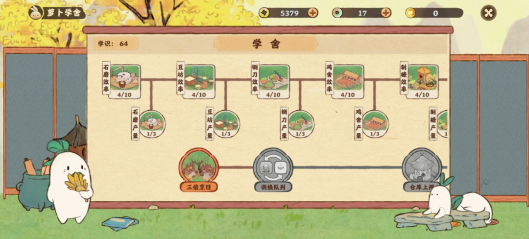 较为细致的是游戏内信息大多做了可视化包装。相较数值驱动,《桃源》更像是内容信息的传播。所有生产建筑升级的技能树,用萝卜学堂巧妙承载。钓鱼也不仅能售卖,更可以在水下造景,“甚至在后期能看到鱼跃的美妙场景”。谷仓升容所需的特殊材料,游戏设置有蒲公英小队,就像《怪物猎人》中的猫咪小队,看到他们轻飘飘地飘走,再带回物品。