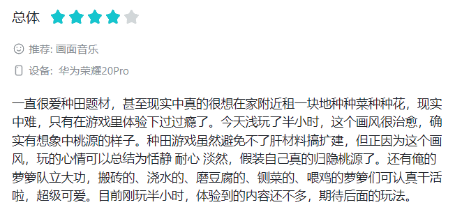 在正式上线前,《桃源》共经历了四次测试,叶田说,整体留存数据还算满意,因此也坚定了团队继续投入资金,甚至整个开发成本让周围朋友惊讶,“你怎么会花这么多去做一款模拟经营”。