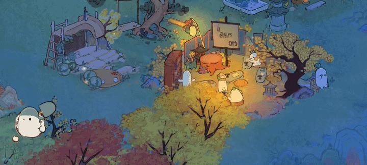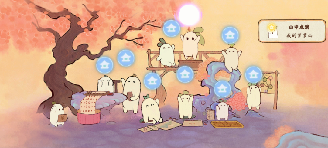 尤为吸引玩家的是萝卜山灵,一个字,萌。有趣的是,叶田说,“萝卜山灵的原型是兔子”,它是美术伙伴为白色耳朵偶然填充绿色的产物。灵感馅饼从天而降,这个创意也就保留了下来。“要设计出避世的桃源,太多人喧闹”,而成群的萝卜山灵则正好。