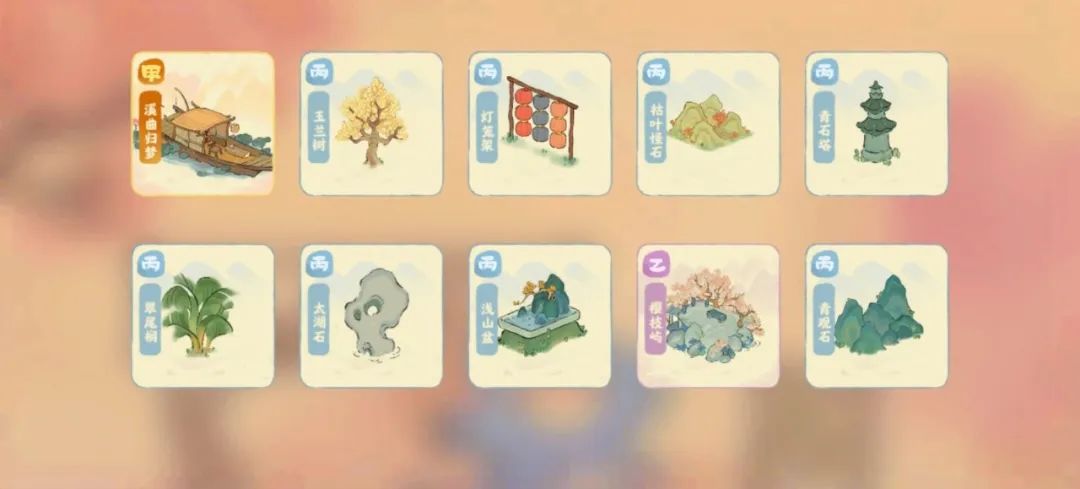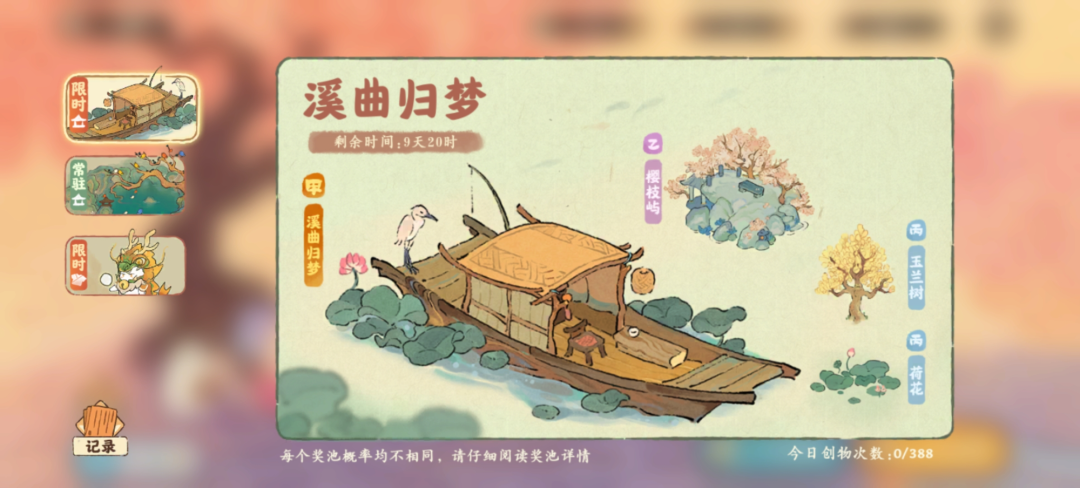 游戏目前的付费点主要在建筑及“幻形”上。前者一方面是游戏随着个人等级提升,用游戏内金币便可购买的萝卜小建筑,另一方面则需要通过“创物”功能抽取。在未氪金的情况下,我也能攒出3个十连抽,还未用完建筑卷轴,已经获得“溪曲归梦”的全套建筑。