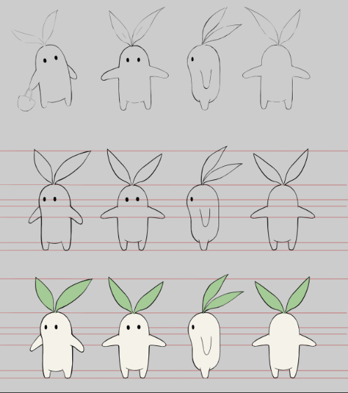最初的设计草图:呆呆眼,脑袋上的绿叶子像耳朵