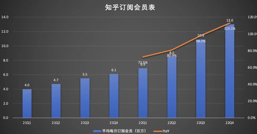 付费会员业务的增长主要受订阅会员持续增长推动。2018年,知乎推出了付费内容;2019年上半年,知乎推出了付费会员计划盐选。知乎付费会员收入大部分来源于盐选。数据显示,知乎第四季度月平均订阅会员数达到1300万,同比增长113.1%,2022年的平均MAUs为1.01亿。