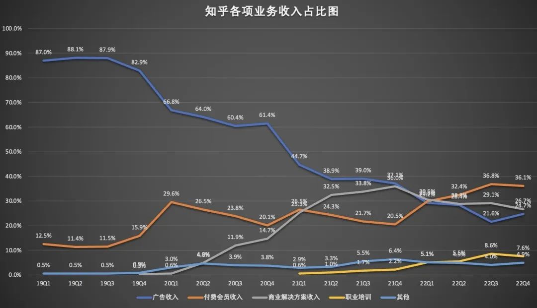 付费会员、职业培训、其他三分部业务收入同比有所增长,其中职业培训业务增速最快,成为知乎业务增长最快“黑马”。广告业务的持续拉垮,付费会员收入取代广告业务,在2022年成为知乎最大的收入来源。