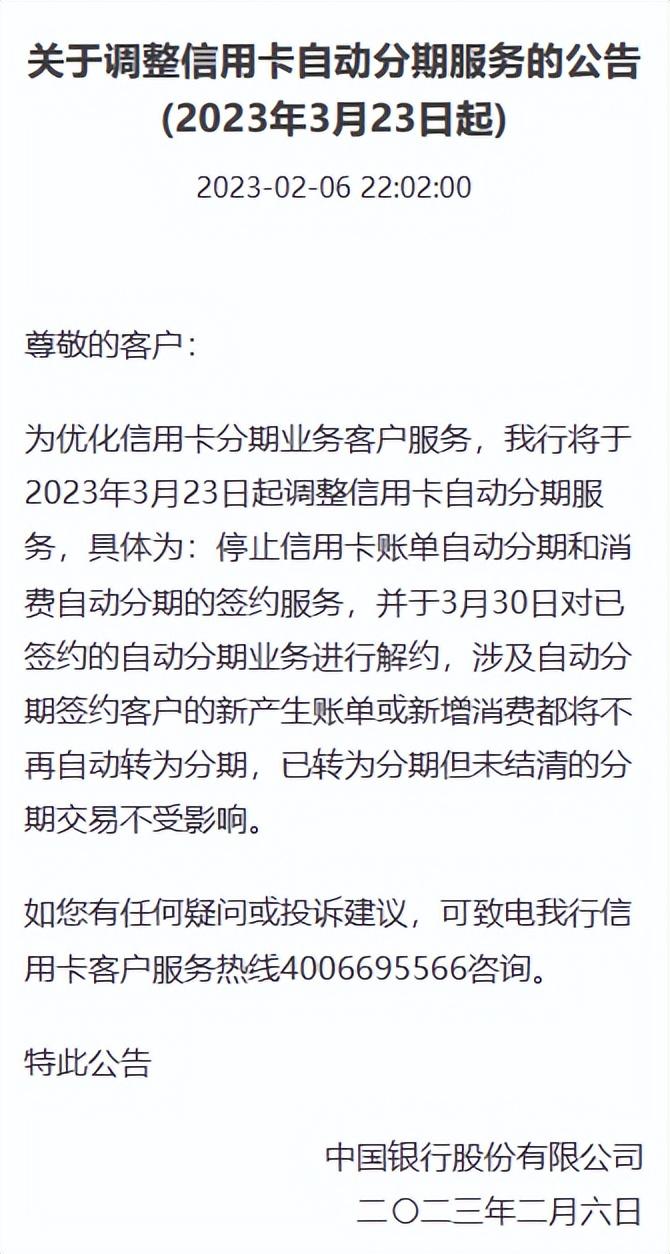 近期,中国银行公告,将于3月23日起停止信用卡账单自动分期和消费自动分期的签约服务,并于3月30日对已签约的自动分期业务进行解约。具体通知如下: