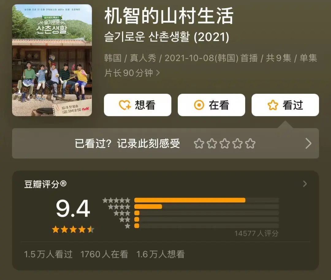 当下“剧衍综”有了更明显的变化,这种变化更早出现在韩娱。大热剧《机智的医生生活》在连出两季后,紧接着推出了由五位原班人马共同担任嘉宾的衍生综艺《机智的山村生活》,作为高口碑、高热度的剧集IP,衍生综艺同样受到了广泛关注,该综艺上线后就在豆瓣获得了9.4分的高分。