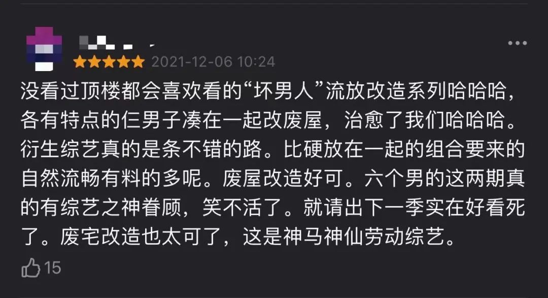 就像有观众在《不会伤害你》的豆瓣热门短评里写道的那样:“没看过《顶流》都会喜欢看的‘坏男人’改造系列。”可见,衍生综艺如果做得好,完全有机会成为更加独立的内容形态,用综艺反哺剧集,将影响力发挥到最大。