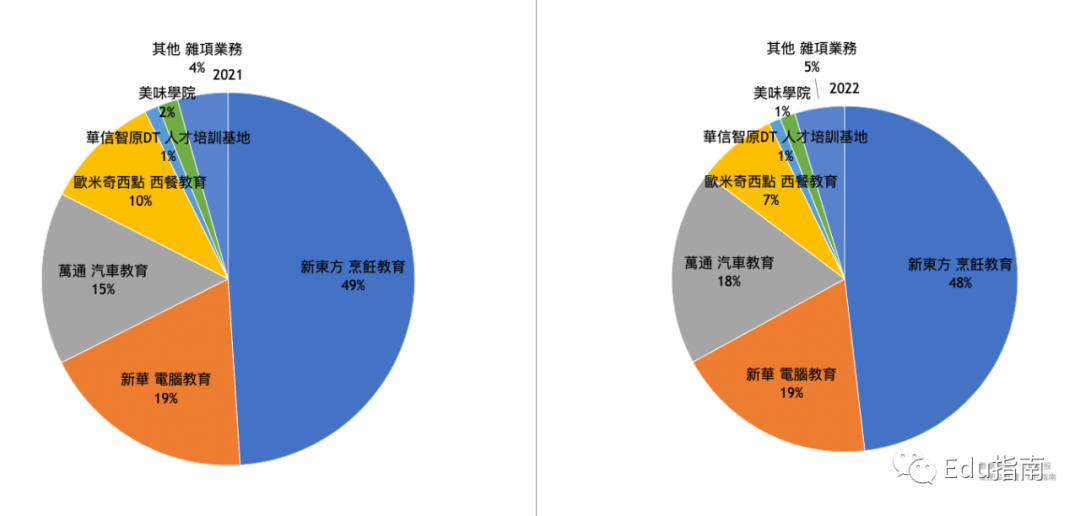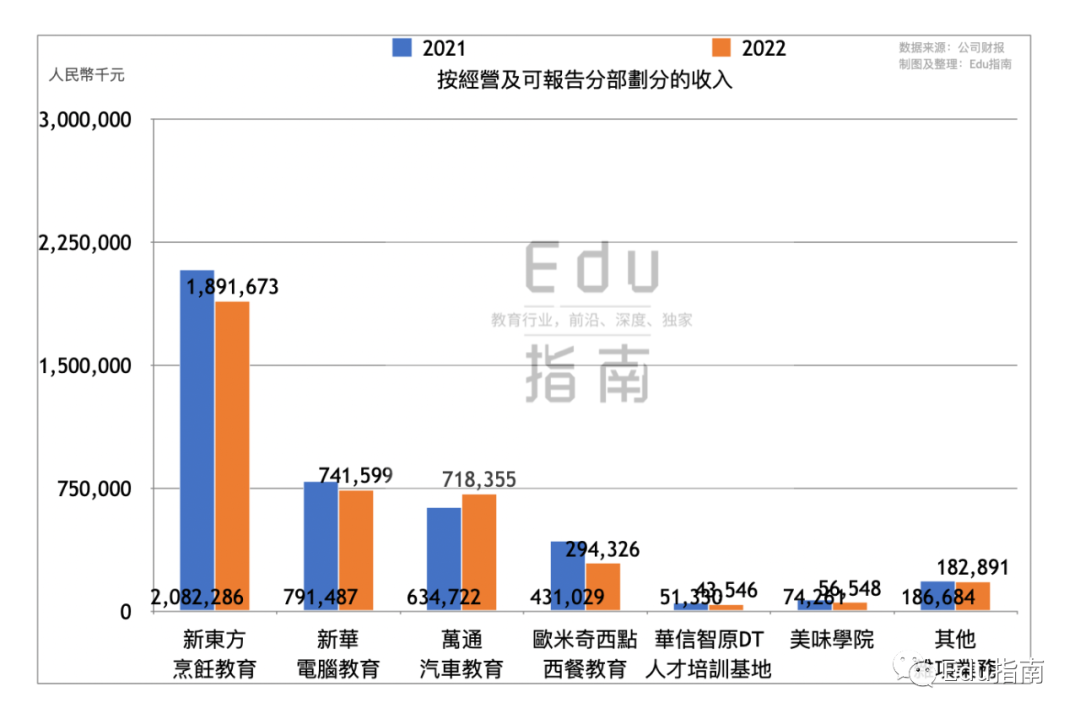 中国东方教育收入来自七分部业务,包括新东方烹饪教育、新华电脑教育、万通汽车教育、欧米奇西点西餐教育、华信智原DT人才培训基地、美味学院、其他。