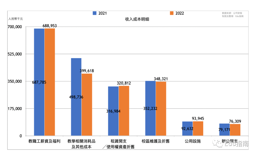其中本财年教职工薪资及福利成本为6.9亿元,与上一财年基本持平。教学相关消耗品及其他成本为4.0亿元,同比减少20%。租赁开支/使用权资产折旧成本为3.2亿元,同比增长1%。校区维护及折旧成本为3.5亿元,同比减少1%。公用设施成本为0.9亿元,同比增长1%。办公开支成本为0.8亿元,同比增幅为4%。
