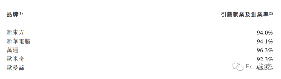 财报称截至本财年该公司万通及欧曼谛教育长期课程毕业生平均引荐就业和创业率在95%以上。烹饪教育新东方、新华电脑及欧米奇引荐就业及创业率在90%以上。