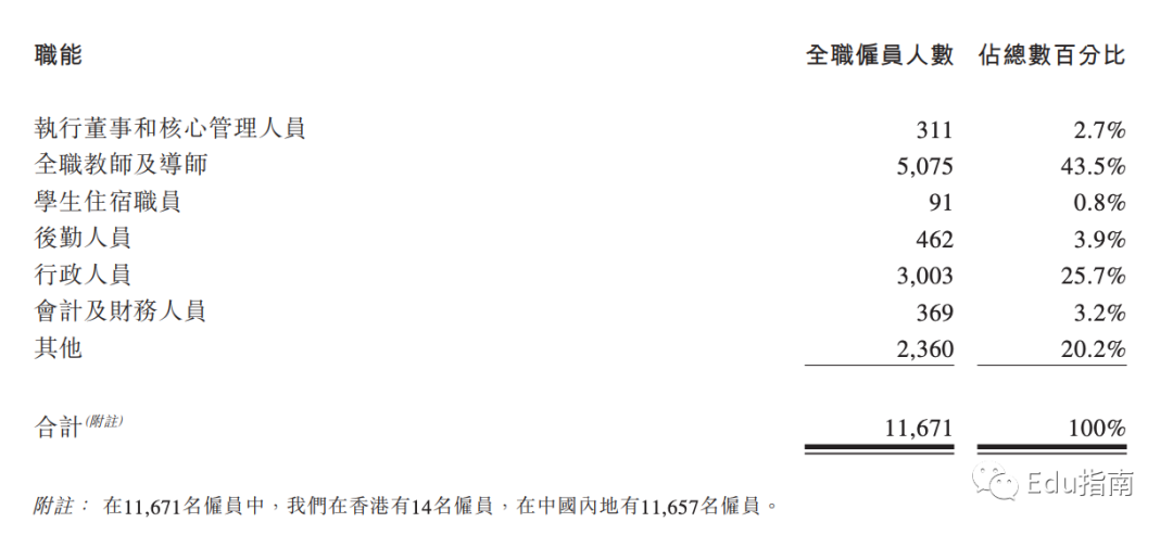 截至2022年12月31日,该公司共有11,671名雇员,其中包括执行董事和核心管理人员311名,占比2.7%。全职教师和导师5075名,占比43.5%。学生住宿职员、后勤人员、行政人员、会计及财务人员、其他职能人员分别有91名、462名、3003名、369名、2360名。