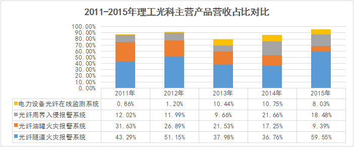 数据显示,2011-2015年间,理工光科光纤隧道火灾报警系统年均营收占比达45.75%,地位不可撼动。而近些年公司产品的盈利点则有意由光纤油罐火灾报警系统向光纤周界入侵报警系统过渡。2011年,其光纤油罐火灾报警系统营收占比达31.63%,但去年该产品的营收占比已经低至9.39%。与此同时,光纤周界入侵报警系统的营收占比则由2011年的12.02%上升至2015年的18.48%。值得一提的是,该产品2014年的营收占比一度达到21.66%。