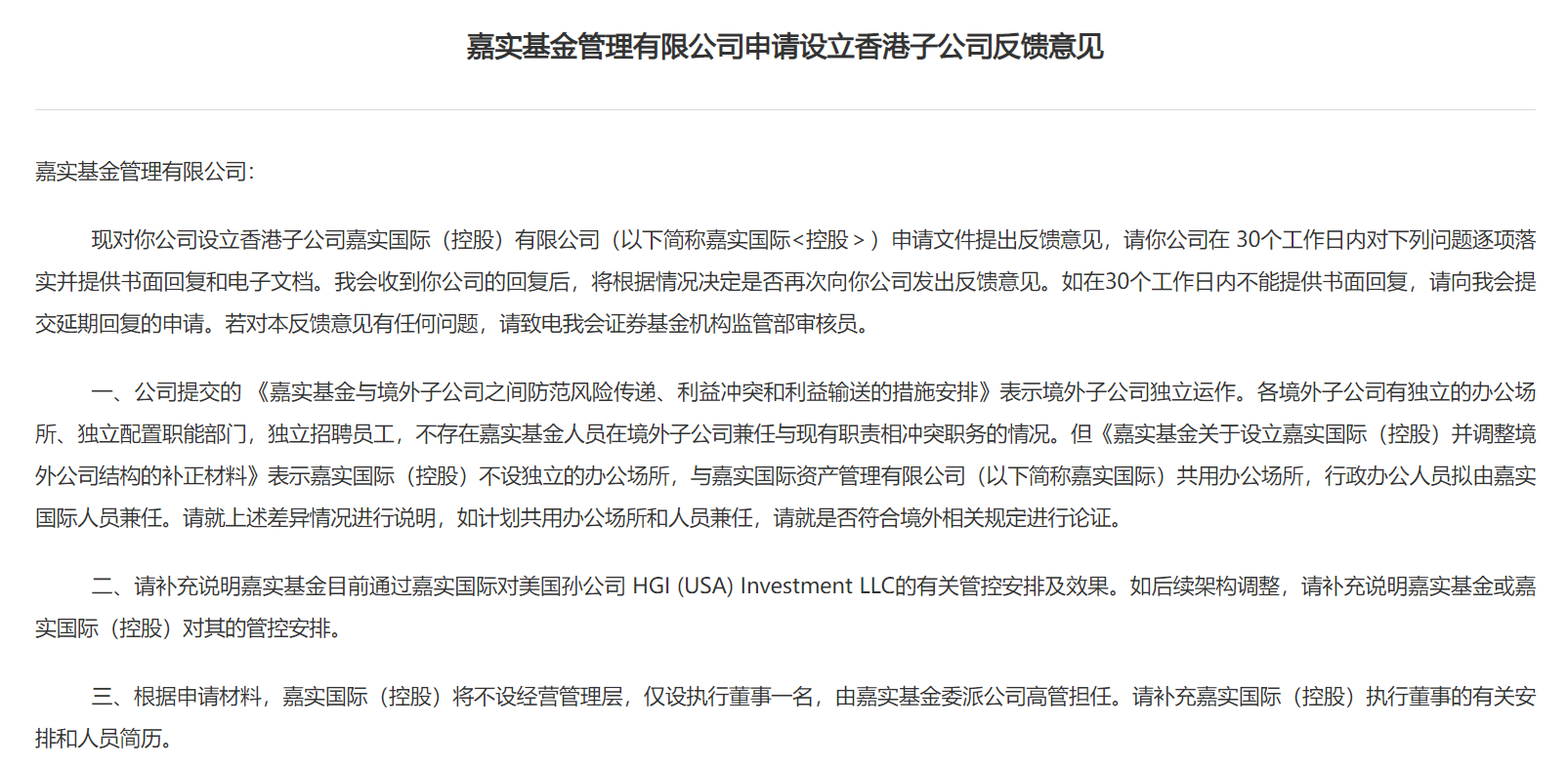 对此,证监会就嘉实基金与境外子公司(嘉实国际控股)之间如何防范风险传递、利益冲突和利益输送的措施进行了询问,要求嘉实基金补充拟设立的嘉实国际控股是否和嘉实国际资产管理有限公司(以下简称嘉实国际)共用办公场所、行政办公人员;此外,要求嘉实基金补充对美国孙公司 HGI (USA) Investment LLC的有关管控安排及效果。