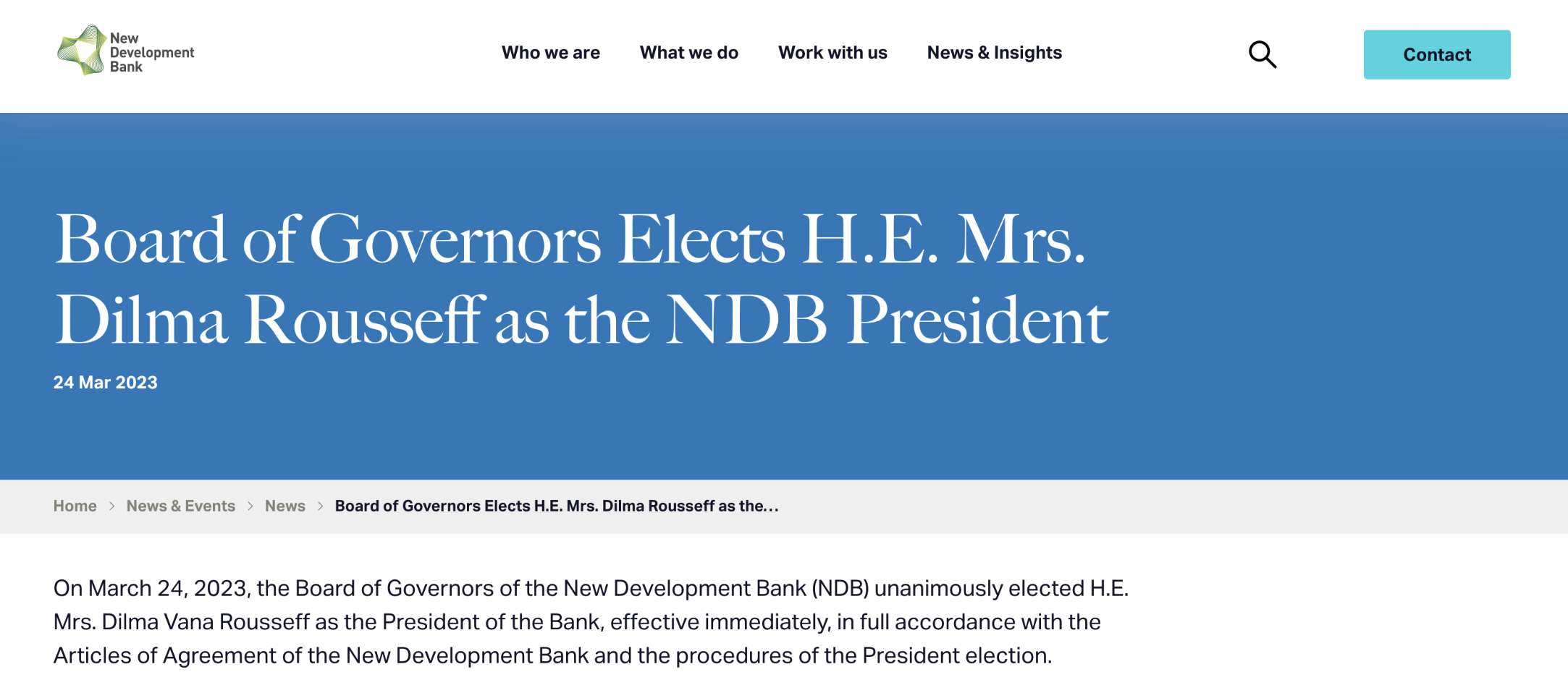 3月24日,金砖国家新开发银行(NDB)在其网站上发布声明称,巴西前总统迪尔玛·罗塞夫当选为该银行行长。