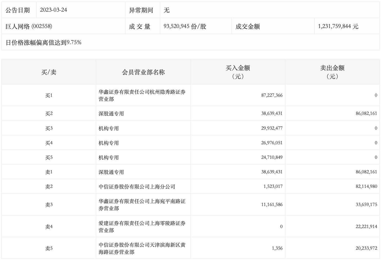 3月24日,巨人网络今日涨停,龙虎榜数据显示,上榜营业部席位全天成交4.64亿元,占当日总成交金额比例为37.71%。其中,买入金额为2.2亿元,卖出金额为2.44亿元,合计净卖出2414.01万元。