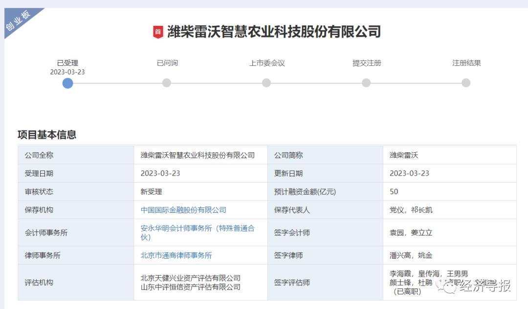 2022年8月29日,潍柴雷沃与中金公司签署了IPO辅导协议;8月30日,潍柴动力董事会审议通过了潍柴雷沃分拆至深交所创业板上市的议案;9月2日,潍柴雷沃在山东证监局进行了辅导备案;2023年1月,辅导工作完成;到今年3月23日IPO申报材料被受理,前后不过7个月的时间。