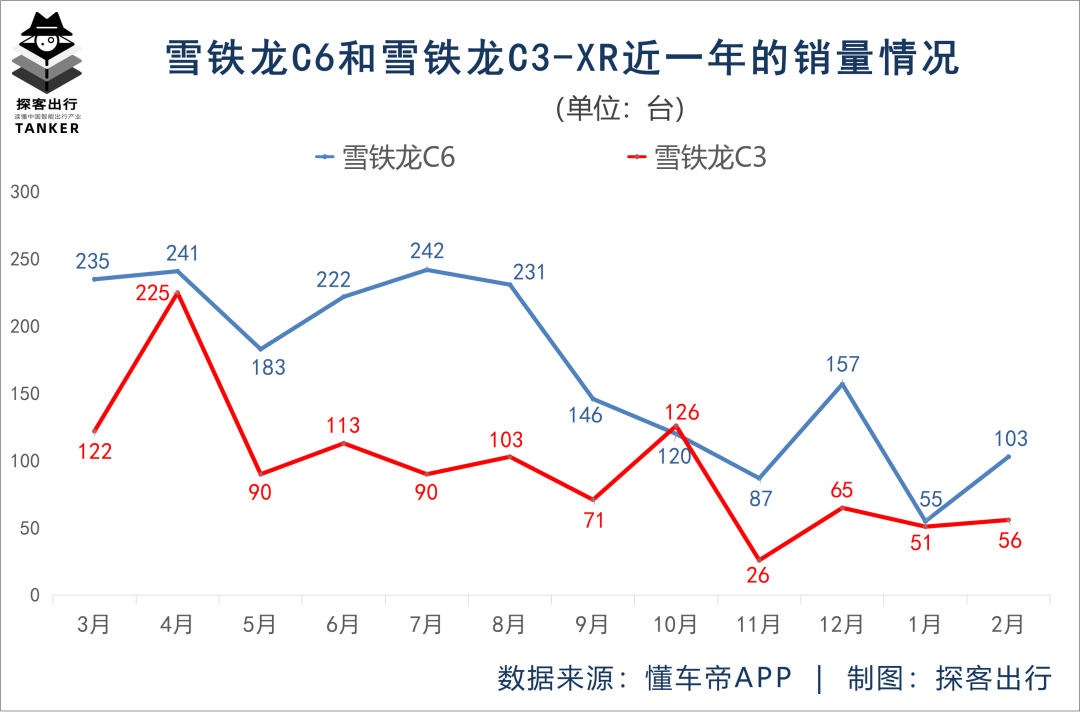 2023年2月雪铁龙C6的单月销量为103台,而在1月的仅有55台。最近一年的累计销量也才2022台,平均月销量不到170台。而另一款因降价被人关注的雪铁龙C3-XR在2月的销量低至56台,而近一年的累计销量仅1138台,月销量不足100台。