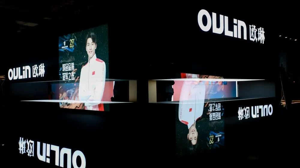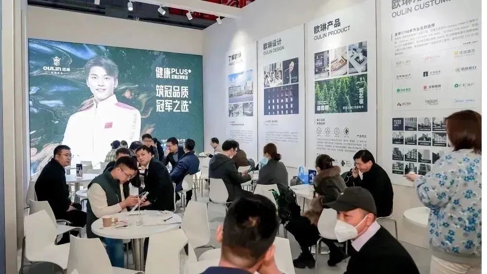 此次建博会欧琳展馆通过场景化展示和多角度光影的打造,带来低调轻奢的美学体验和视角。200米混合泳冠军,欧琳品牌代言人汪顺巨幅海报在展厅内外的设计应用,不仅完美呼应了本次展会欧琳“健康Plus+ 筑冠品质”的主题,还使欧琳在众多高端参展品牌中脱颖而出,熠熠生辉。