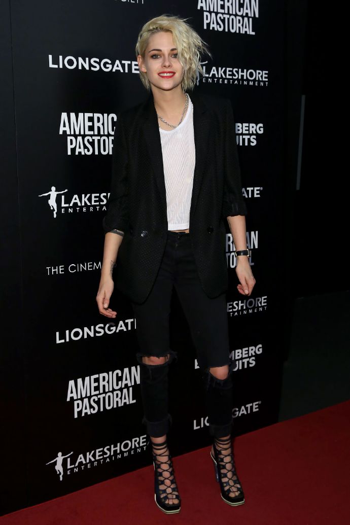克里斯汀身着黑色双膝破洞的MOTHER牛仔裤,显示出她典型的前卫摇滚打扮。身穿白色基本款T恤外搭干练的西装外套,整体着装十分协调,再配上一双性感的系带高跟鞋,银质的锁样项链加上美颜的大红唇她完美展示了自己香奈儿形象大使应有的样子。