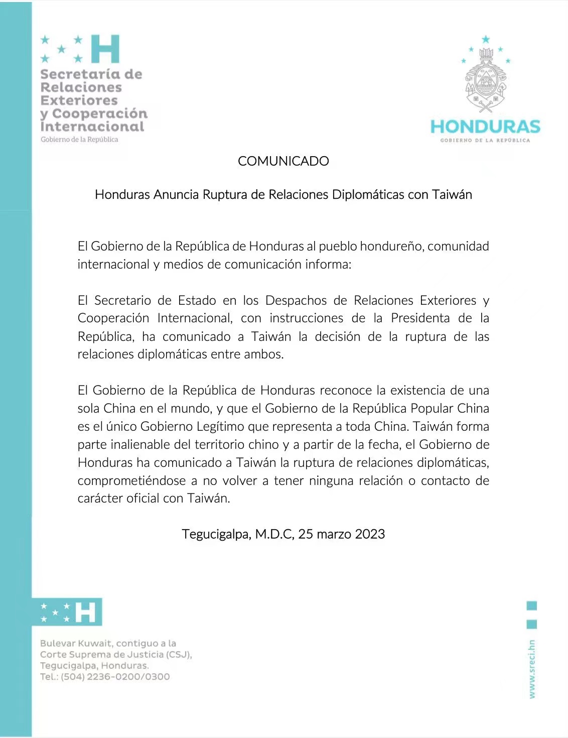 据央视新闻,当地时间3月25日,洪都拉斯外交部发表声明,正式宣布与中国台湾断绝“外交关系”。