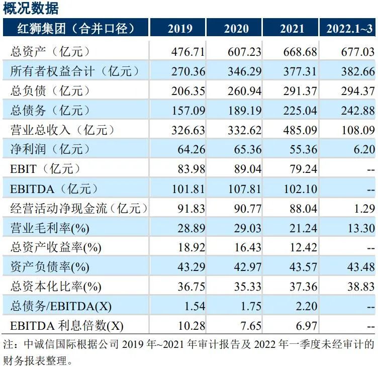 红狮集团有限公司是国家发改委、国土资源部和中国人民银行联合发文重点支持的十二家全国性大型水泥企业之一。公司2021年末总资产6,68.68亿元。据中国水泥网统计,2019-2020 年红狮在全球水泥熟料产能排名均列第 6 位,2021 年全球水泥熟料产能排名为第5位。2022年上半年,红狮集团实现营业收入233.64亿元,净利润约16.74亿元,较2021年同期下降40%。