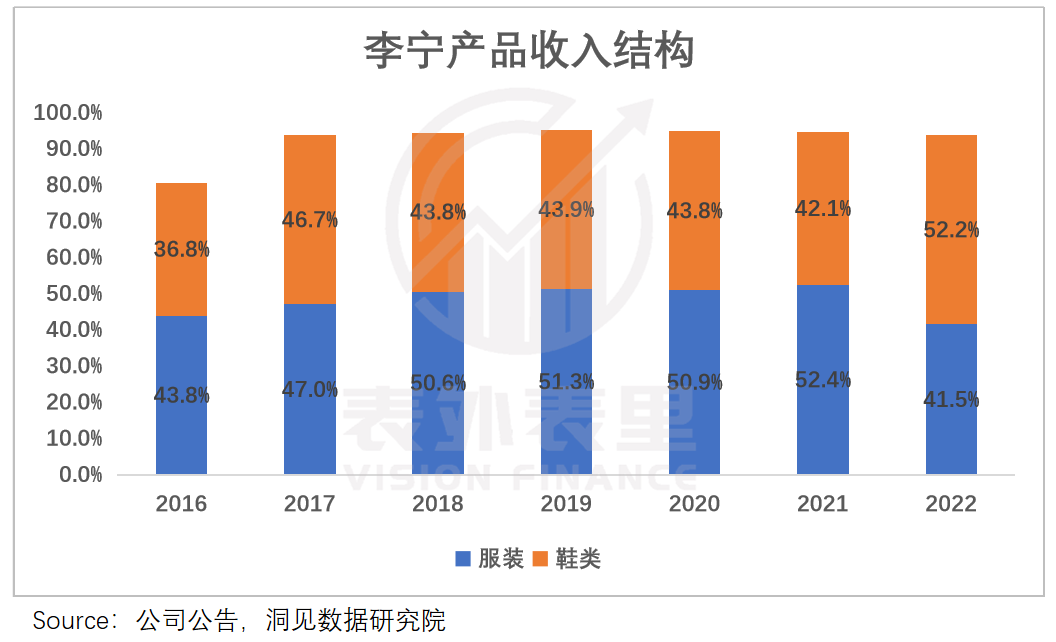 雪上加霜的是,李宁还对产品结构进行了调整,鞋类收入占比同比上升10%,反超服装收入占比。