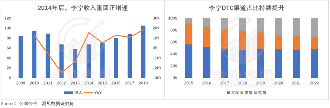 实际上,李宁上一波DTC深化改革要追溯到2014年,最开始确实效果显著,当年业绩实现了16%的高增速。(当然,2014年的高峰值,很大程度上源于,DTC改革下,公司收入口径发生了变化。简单理解就是从批发口径,转换到零售口径。)