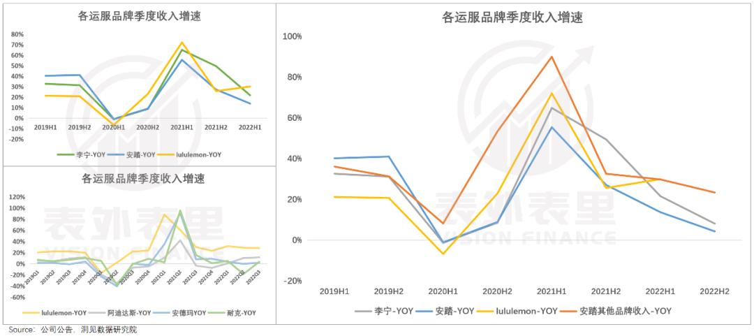 企业经营上,也有类似的迹象。可以看到,在大赛道万马齐喑时,聚焦细分专业市场的Lululemon、迪桑特等,增速向上——2022Q3,Lululemon收入增速保持在30%左右;迪桑特、kolon流水增速达到40%-45%。