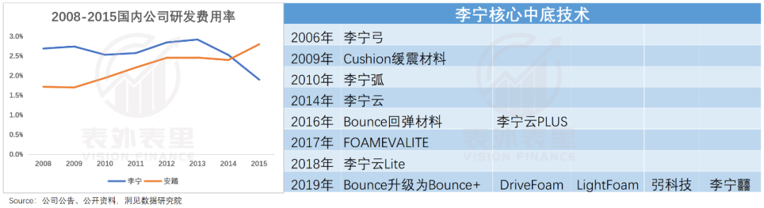 2015 年开始,安踏的研发投入后来居上。但过了将近6年,才有成果产出。