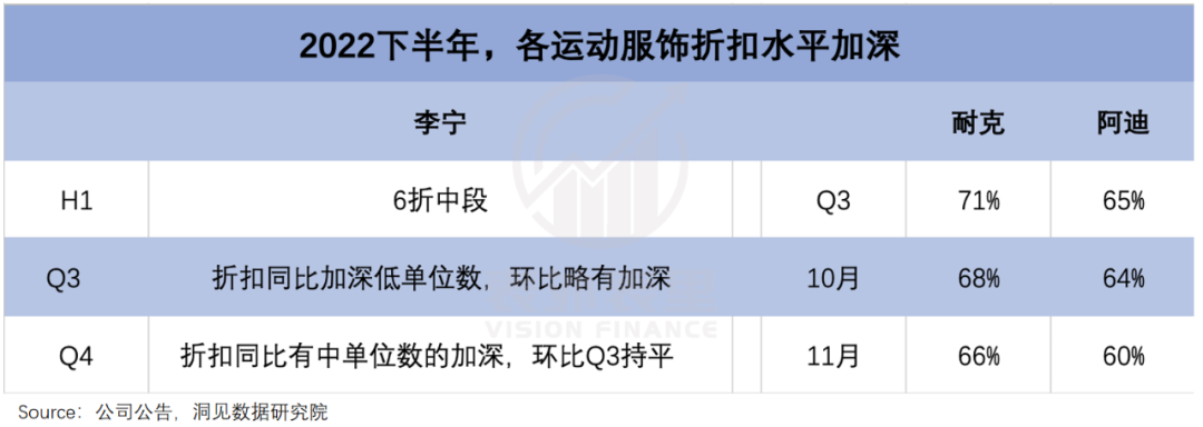 可以看到,去年下半年运动品牌集体掀起降价潮,安踏综合折扣在7.5折,李宁打到了6.5折,而阿迪达斯和耐克最低折扣杀到6折左右。