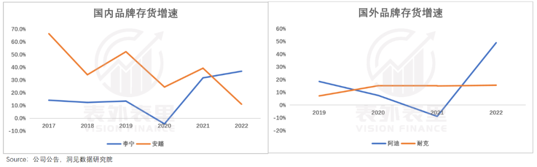 这种困境,同样体现在李宁2022年报里。公告显示,李宁存货同比上涨37%,是目前国内几家头部运服品牌里唯一增速上涨的。