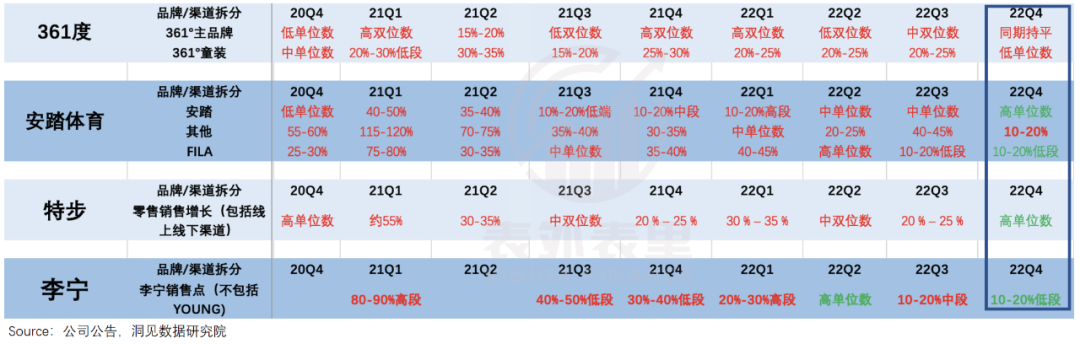 但效果不尽人意,可以看到,2022Q4一众国产运服品牌零售流水均出现了一定程度的恶化,而李宁的情况最棘手,负增速达10%-20%。