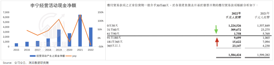 而销售的不给力,也将李宁经营活动现金流同比下拉40%,创下近7年来最大跌幅。李宁方面表示,这是“为支持供应商,缩短了应付的账期”。