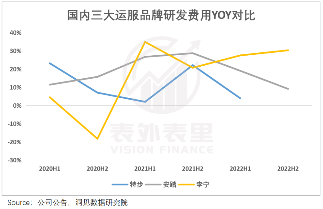 可以看到,2022年在安踏、特步囿于环境压力,对研发开支有所回撤时,李宁的研发投入增长,反而持续上扬。