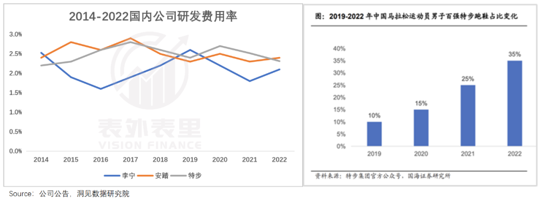 同样是后进者的特步,也有类似的经历。2013年左右,提出回归运动,聚焦“跑步专家”定位后,逐年加大研发费用投入,2018年超越安踏,成为业内第一。