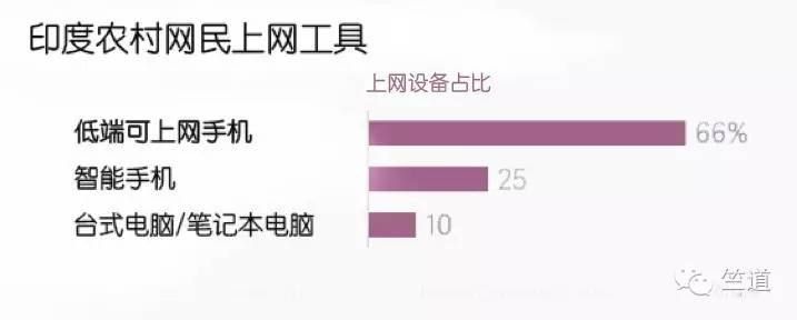 印度农村66%的网民通过智能手机上网,仅有10%的网民使用电脑和笔记本。