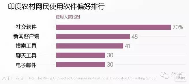 图片为印度农村网民使用APP偏好,由高到低依次为:社交网络、新闻客户端、搜索引擎、聊天工具、电子邮件。