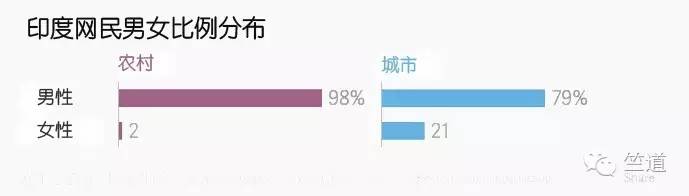 图片为印度农村和城市的男女网民各自所占比例,其中农村女网民数仅占2%。