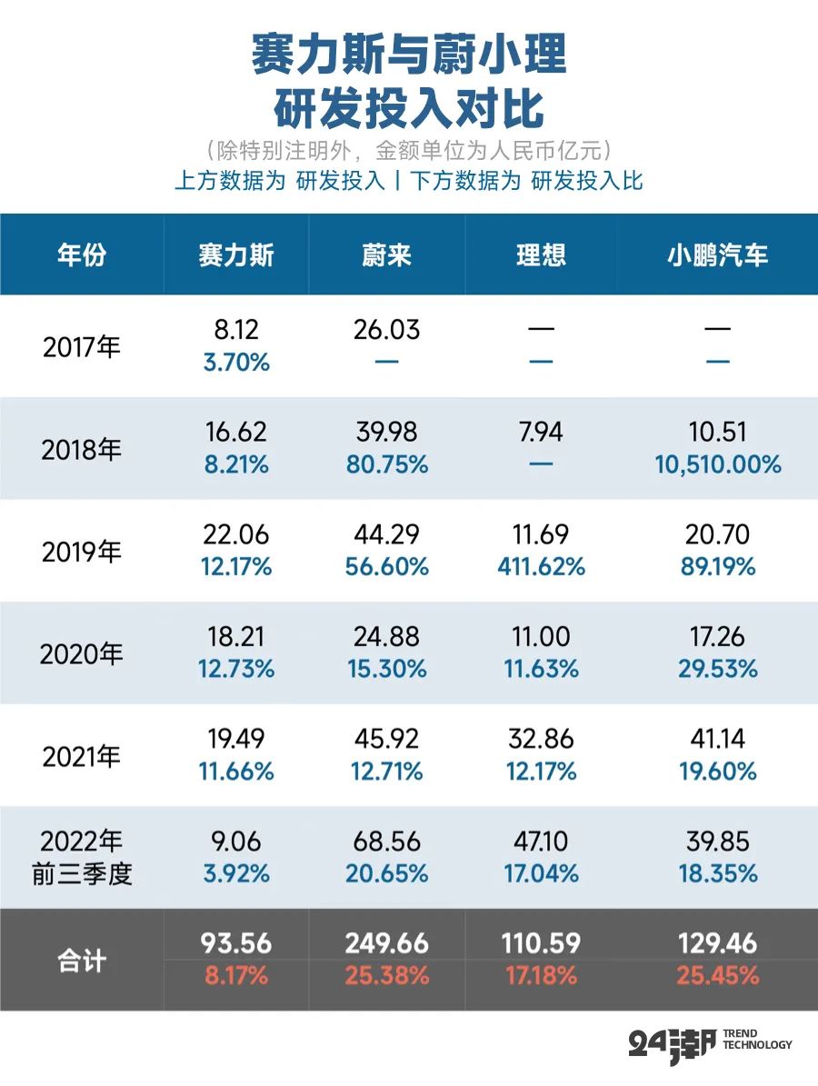 此外据24潮统计,赛力斯无论是研发投入规模,还是研发投入占营业收入比例较 “蔚小理” 等竞争对手都存在一定差距,以2022年三季报位列,前三季度赛力斯研发投入规模仅为9.06亿元,仅是 “蔚小理” 中最低的小鹏汽车研发投入规模的22.74%,仅为蔚来汽车的13.21%。