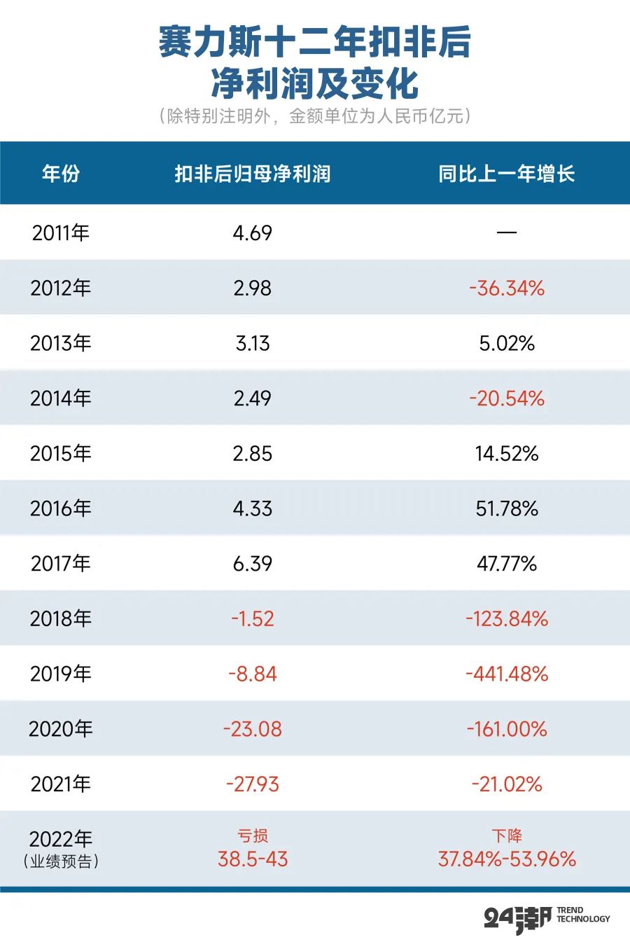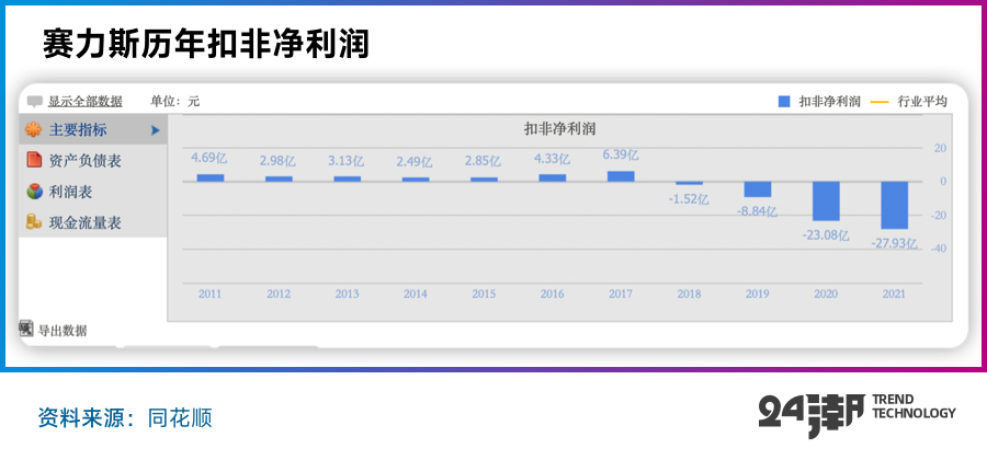 据24潮统计,过去五年间(2018年-2022年)赛力斯合计亏损(扣非后归母净利润,下同)99.87亿元-104.37亿元。而在之前的7年间(2011-2017年)赛力斯创造的净利润也不过26.86亿元。