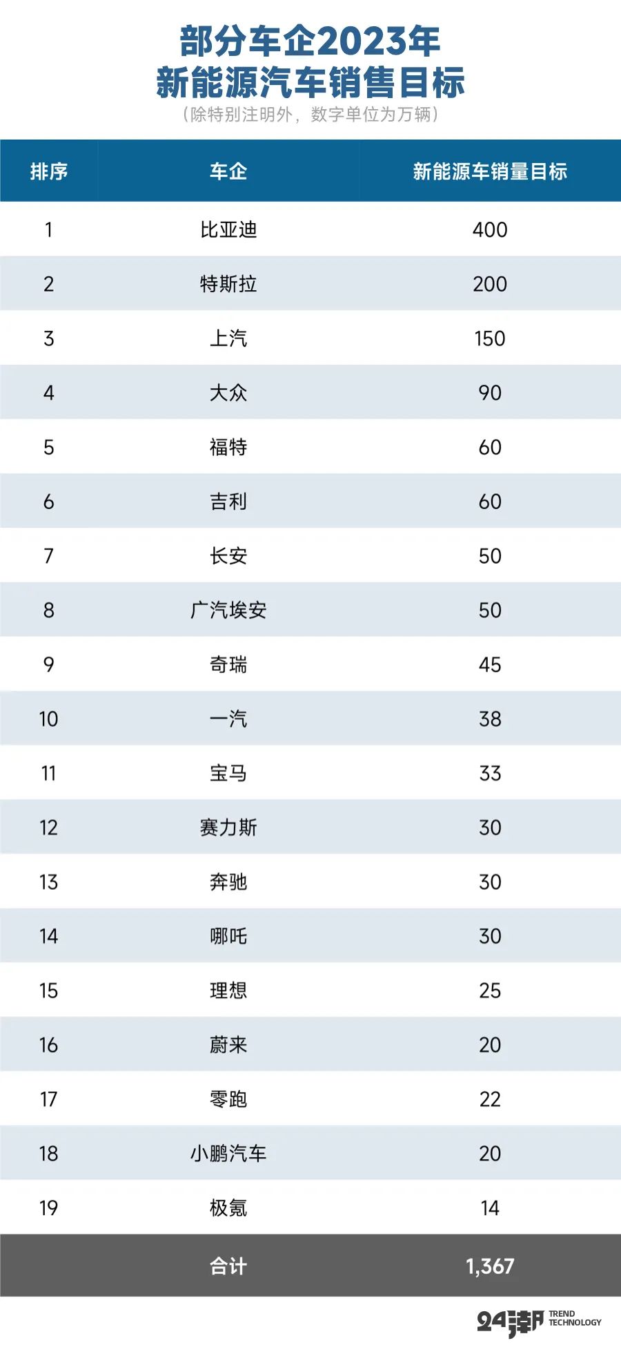 而据24潮团队统计,截止目前仅19家车企公布的新能源汽车销量目标合计已达1367万辆,其中仅比亚迪、特斯拉两者合计销售目标高达600万辆,占比达43.89%,而诸如长城汽车、日产、丰田等诸多车企巨头尚未公布明确的销售目标,2023年供大于求已是大概率事情。