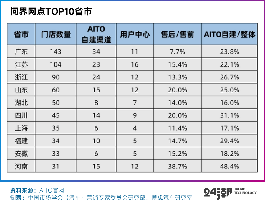 搜狐汽车统计,问界自建渠道(包括体验展厅及用户中心)占比不足25%。许多西部地区及三四线城市,都是倚仗华为门店来覆盖。