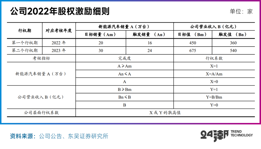 在2022年8月赛力斯曾发布股权激励计划,拟向激励对象授予股票期权数量不超过3600万份,覆盖员工3254人(占公司2021年末总人数的24.06%),包括公司董事、高管、核心技术/业务人员、对公司经营业绩和未来发展有直接影响的员工等,与 2021 年股权激励计划相比,覆盖员工比例进一步提高,有利于充分调动员工积极性,激发人才内生动力和潜力。考核目标方面:2022 年新能源汽车销量目标 16-20 万台。