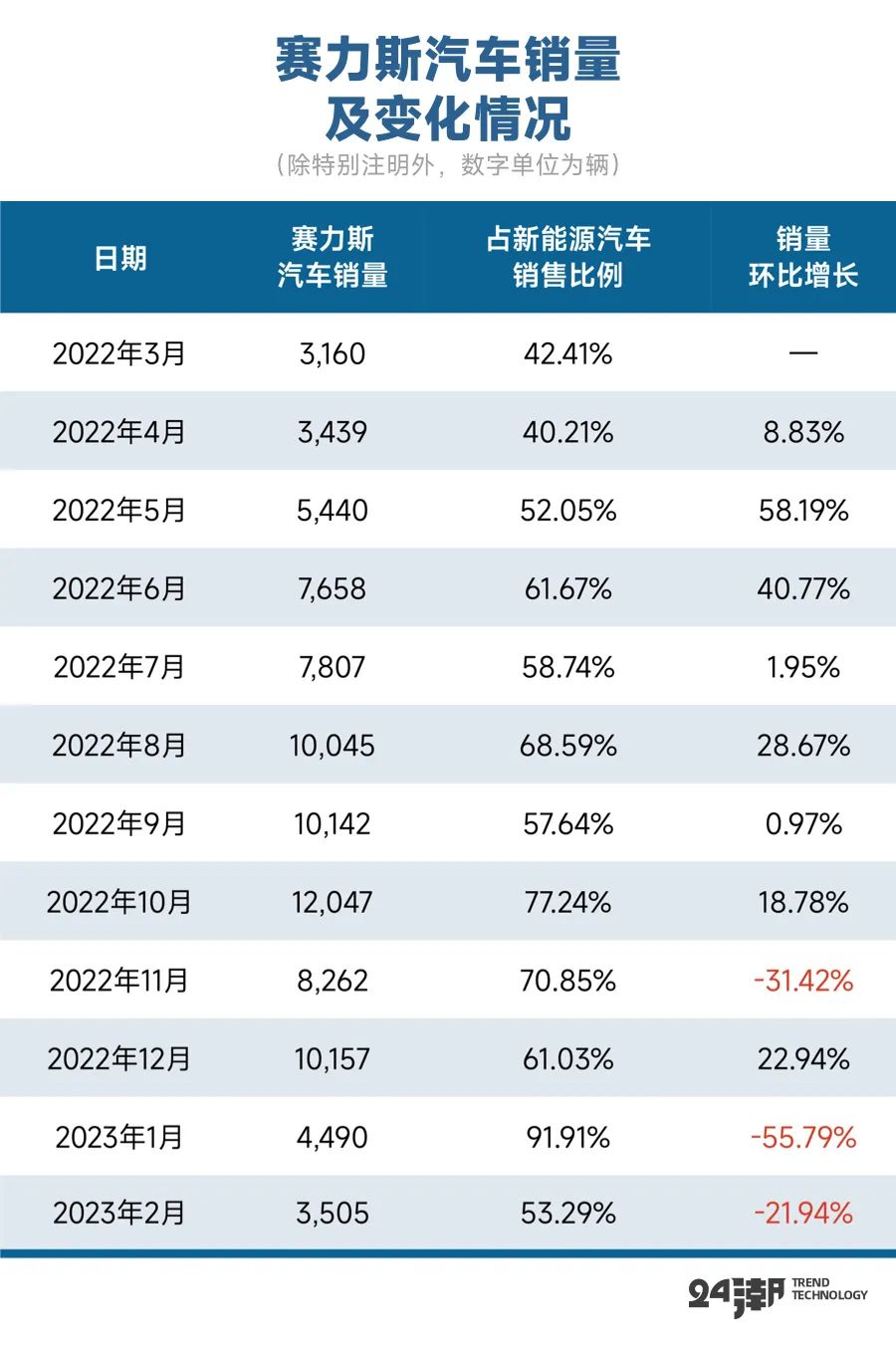最新数据显示,赛力斯汽车销量已经连续两个月度环比负增长,比如据24潮统计,2023年1/2月份,赛力斯汽车销量分别环比下降了55.79%和21.94%,这是过去一年内首次出现连续两个月负增长。形势不容乐观。